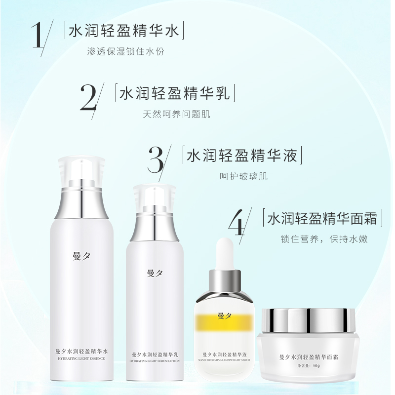 曼夕水润轻盈精华水:鲁G妆网备字2022007093 曼夕水润轻盈精华乳:鲁G妆网备字2022007091 曼夕水润轻盈精华面霜:鲁G妆网备字2022007096 曼夕水润轻盈精华液:鲁G妆网备字2022007092