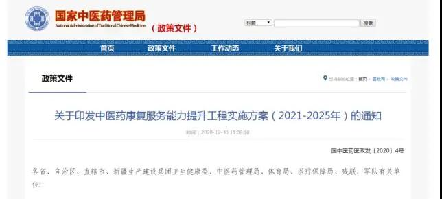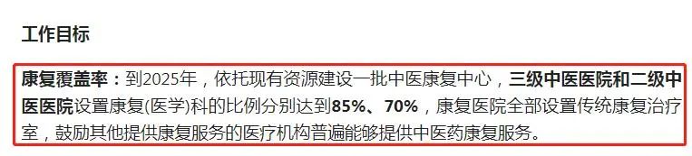《通知》指出到2025年,依托现有资源布局建设一批中医康复中心,三级中医医院和二级中医医院设置康复(医学)科的比例分别达到85%、70%,康复医院全部设置传统康复治疗室,鼓励其他提供康复服务的医疗机构普遍能够提供中医药康复服务。