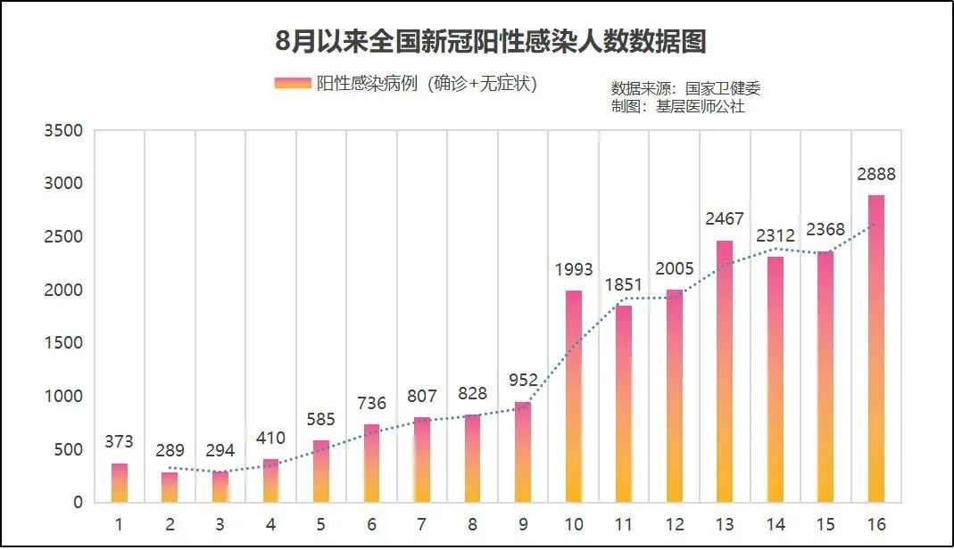 昨日(8月17日)国家最新统计数据显示,全国昨日新增新冠阳性病例2888例,其中确诊病例566例,无症状感染2322例。