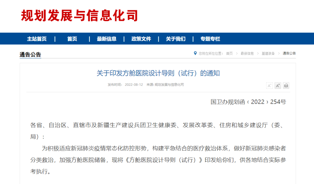 8月12日,国家卫生健康委、国家发展改革委、住房城乡建设部三部门公布《关于印发方舱医院设计导则(试行)的通知》,要求构建平急结合的医疗救治体系,做好新冠肺炎感染者分类救治,加强方舱医院储备。