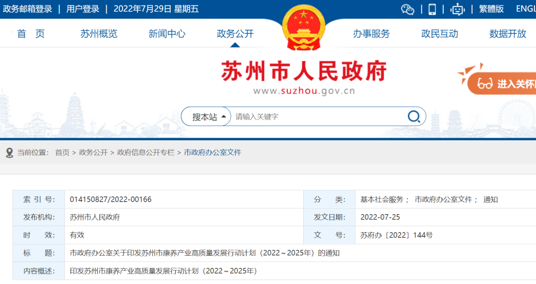 市政府办公室关于印发苏州市康养产业高质量发展行动计划(2022~2025年)的通知
