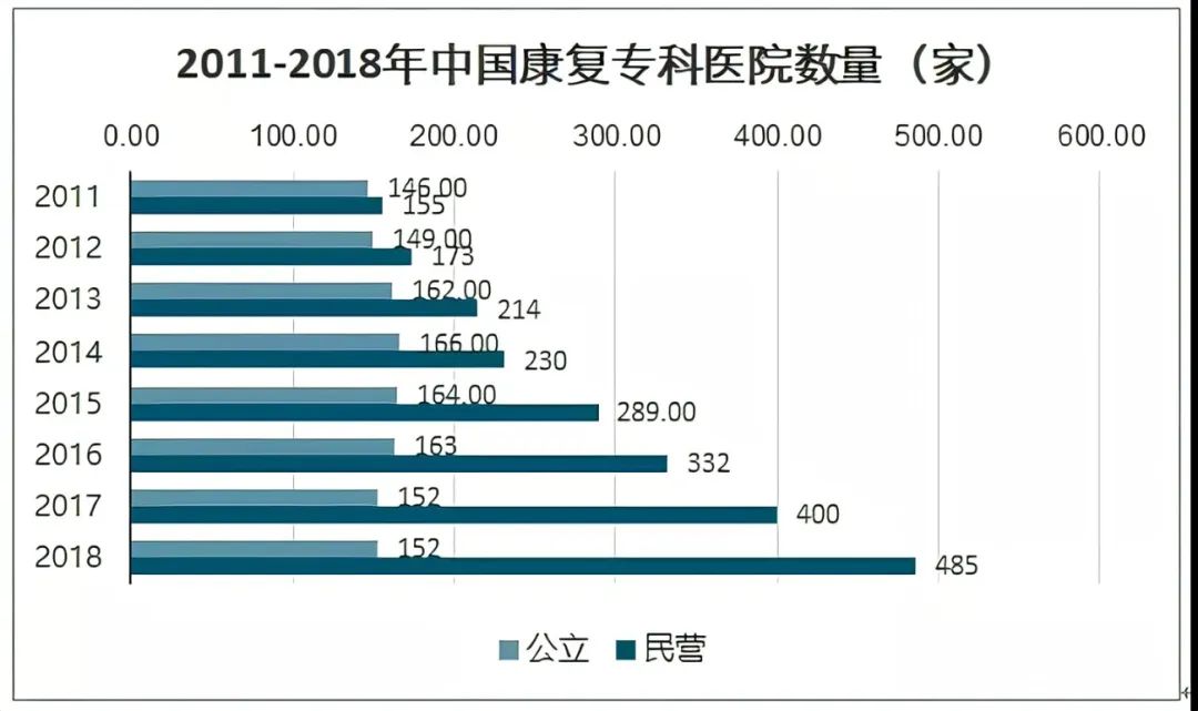 从图表可以看出:无论是公立康复医院还是民营康复医院在数量上都呈现正向增加的趋势。