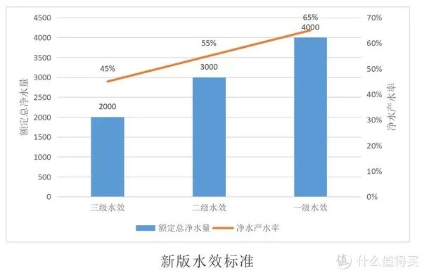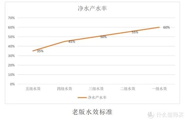 水效就是产水的效率,是指在规定的试验条件下,原水经过净化后,净水机的总净水量占总进水量的比例。可以简单理解为一定时间内,纯水机最后一级过滤后产水量和原水进水量的比例。保证较高的脱盐率的情况下,水效自然越高越好。下图为新旧两版水效等级标准。