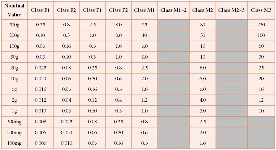 谈到校准,起到至关重要作用的就是砝码。砝码的形状、尺寸、材料、表面状况、密度、磁性、质量标称值、最大允许误差等指标都有非常严格的规定。作为标定、校验衡器的最普遍也是最重要的工具,国际法制计量组织(OIML)对砝码进行了明确的等级划分,共分为9个等级。在砝码的众多指标当中,和校准关联度最高的就是最大允许误差(MPE)了,国际相关法规条款对各个等级的砝码的MPE有明确的规定,以下表格是对电子天平所常用质量标称值砝码MPE的说明(误差值以毫克为单位):