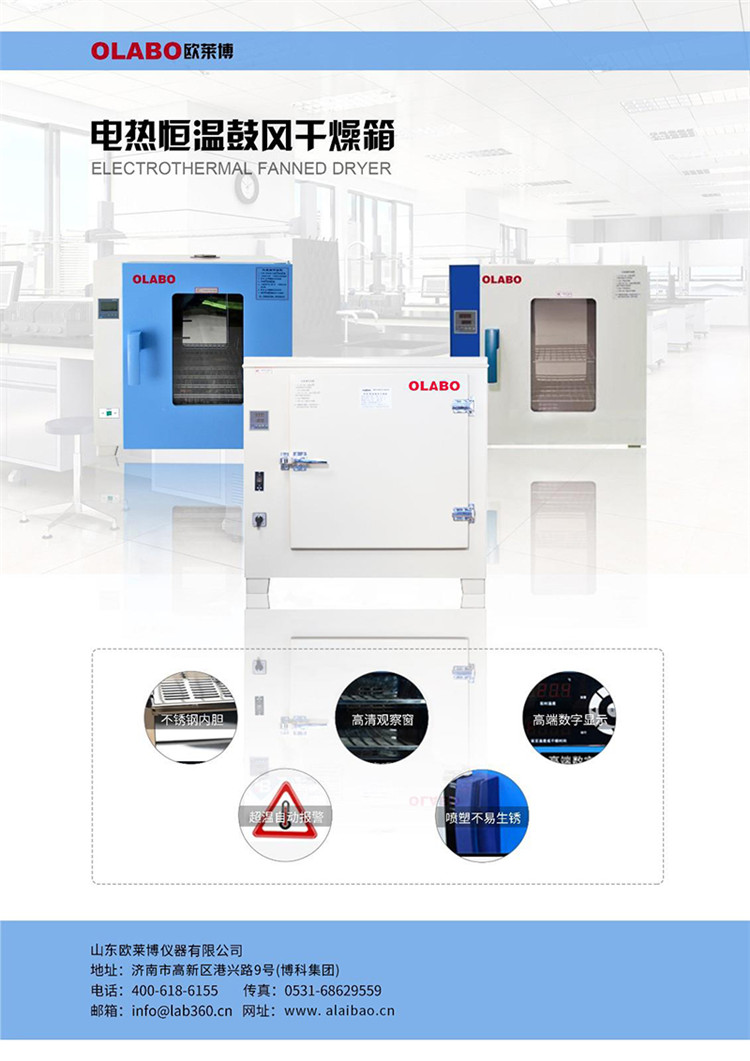 欧莱博鼓风干燥箱型号齐全,价格优势大,厂家直发,发货速度快!不锈钢工作室,微电脑控温仪,超温保护,传感器断路/短路保护,自动报警。可供工矿企业、化验室、科研单位等作干燥、烘焙、熔蜡、灭菌之用。