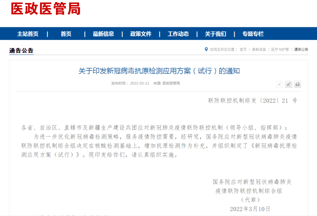 3月11日,国家卫生健康委员会官网发布《关于印发新冠病毒抗原检测应用方案(试行)的通知》(简称“通知”),表示决定在核酸检测基础上,增加抗原检测作为补充,并组织制定了《新冠病毒抗原检测应用方案(试行)》(简称“试行方案”)。