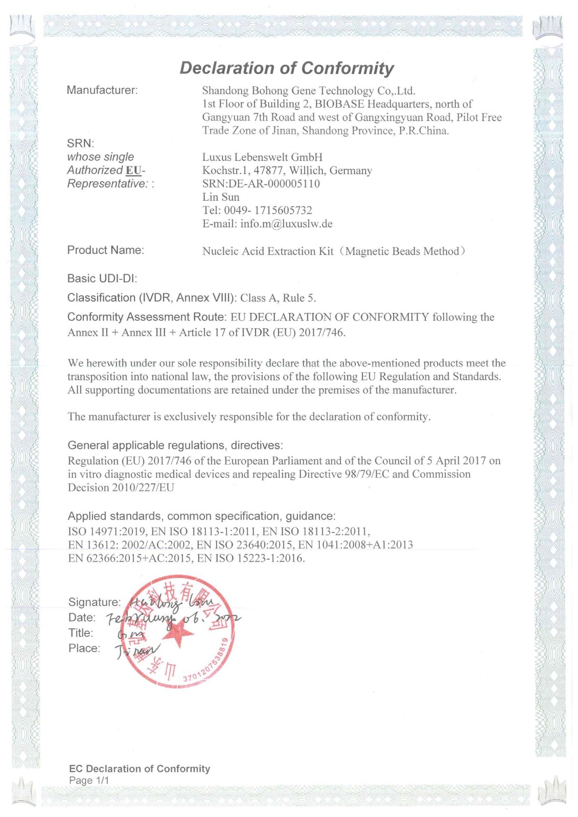 热烈祝贺山东博弘基因科技有限公司核酸提取试剂盒、核酸提取仪和一次性使用病毒采样管取得CE认证!