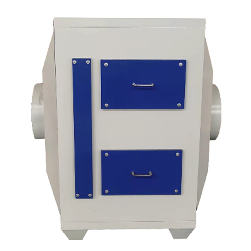 主要部件包括: 活性炭箱箱体、初效过滤器以及优质蜂窝活性炭 箱体:1.0mm厚一级冷轧钢板,表面经酸洗、磷化,再经环氧树脂粉末静电喷涂 处理,具有一定耐酸碱、耐腐蚀; 初效过滤器:可处理废气中颗粒较大的杂质,延长蜂窝活性炭的使用寿命 蜂窝活性炭:碘值500,比表面积大,通孔阻力小,高吸附容量,使用寿命长
