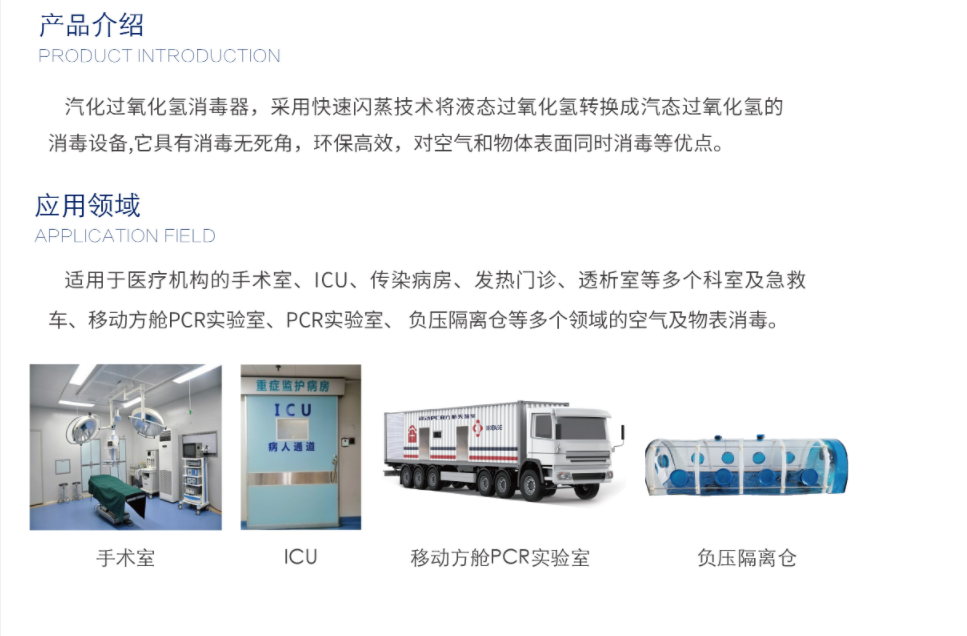 适用于医疗机构的手术室、ICU、传染病房、发热门诊、透析室等多个科室及急救车、移动方舱PCR实验室、PCR实验室、 负压隔离仓等多个领域的空气及物表消毒。