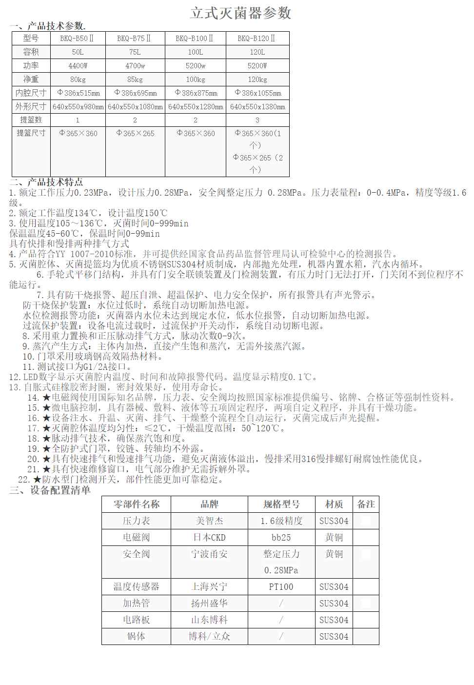 安全防护 1、超温自动保护装置:超过设定温度,系统自动切断加热电源; 2、防干烧保护装置:水位过低时,系统自动切断加热电源; 3、超压自动泄放装置:超过安全阀开启压力,安全阀开启泄压; 4、过流保护装置:设备电流过载时,过流保护开关动作,系统自动切断电源; 5、漏电保护装置:当设备出现漏电故障时,系统自动切断电源。 6、安全连锁装置:新型的压力温度双重安全联锁,设备起压后,门无法代开。 7、门检测装置:只有灭菌器门关闭到位,电源才能接通加热产生蒸汽。