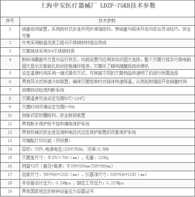 本品为医疗器械产品,属于压力容器受控产品,符合压力容器设计与制作的相关规定,并取得了食药监产品注册证和消毒产品卫生许可证,是我厂研制开发的新一代智能型立式压力蒸汽灭菌器,具有快捷简便的操作方式和功能齐全的控制系统,在安全控制上;具有超压自泄、断水保护、超温自控的数套安全联锁的装置。本品操作系统采用微机自动处理技术,灭菌运行过程实行微机自动控制,操控台上的液晶显示窗显示整个灭菌动态和功能运行情况,产品主要部件采用不锈钢材料精制而成,灭菌指标达到医用手术级标准,是供医疗机构对可耐压力、耐高温蒸汽的医疗器械或卫生用品进行灭菌或消毒的理想产品。
