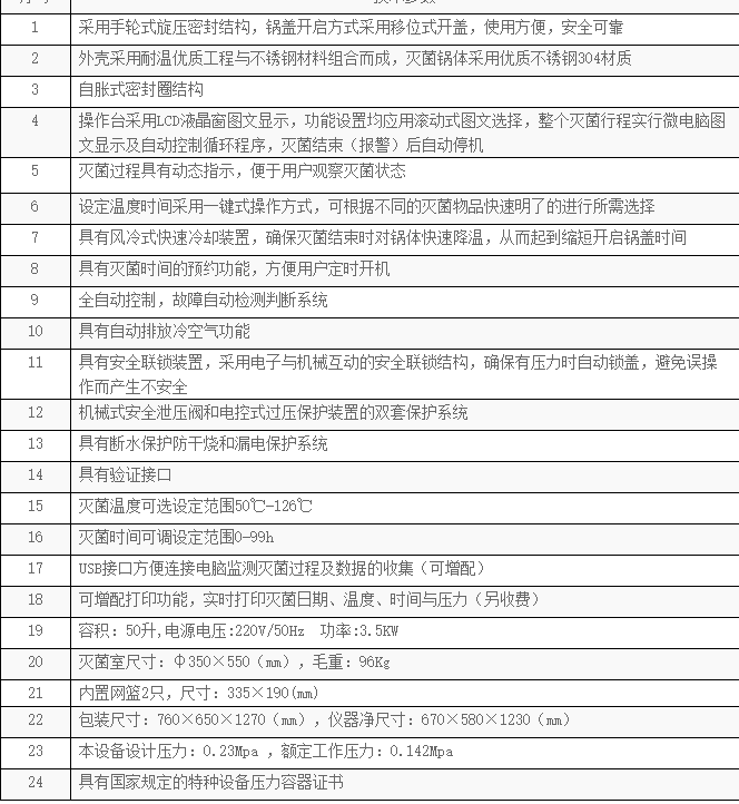 本品非医疗器械产品,属于压力容器受控产品,符合压力容器设计与制作的相关规定。其结构安全可靠,具有快捷简便的操作方式和功能齐全的控制系统,在安全控制上;具有超压自泄、断水保护、超温自控的数套安全联锁的装置。本品操作系统采用微机自动处理技术,灭菌运行过程实行微机自动控制,操控台上的液晶显示窗显示整个灭菌动态和功能运行情况,产品主要部件采用不锈钢材料精制而成,是各大专院校、食品化工、生物科研等单位对器械、食品器皿、培养基等物品进行灭菌的理想产品。