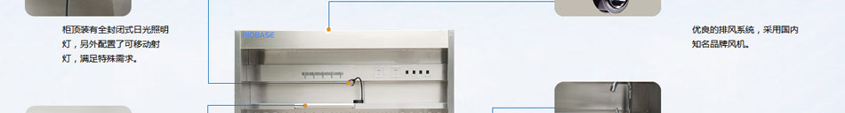 2. 下排气系统,大功率吸风装置,低噪音。下排风,长条形百叶式耐酸碱不锈钢排气孔。泛仕达250风机。(标配)
