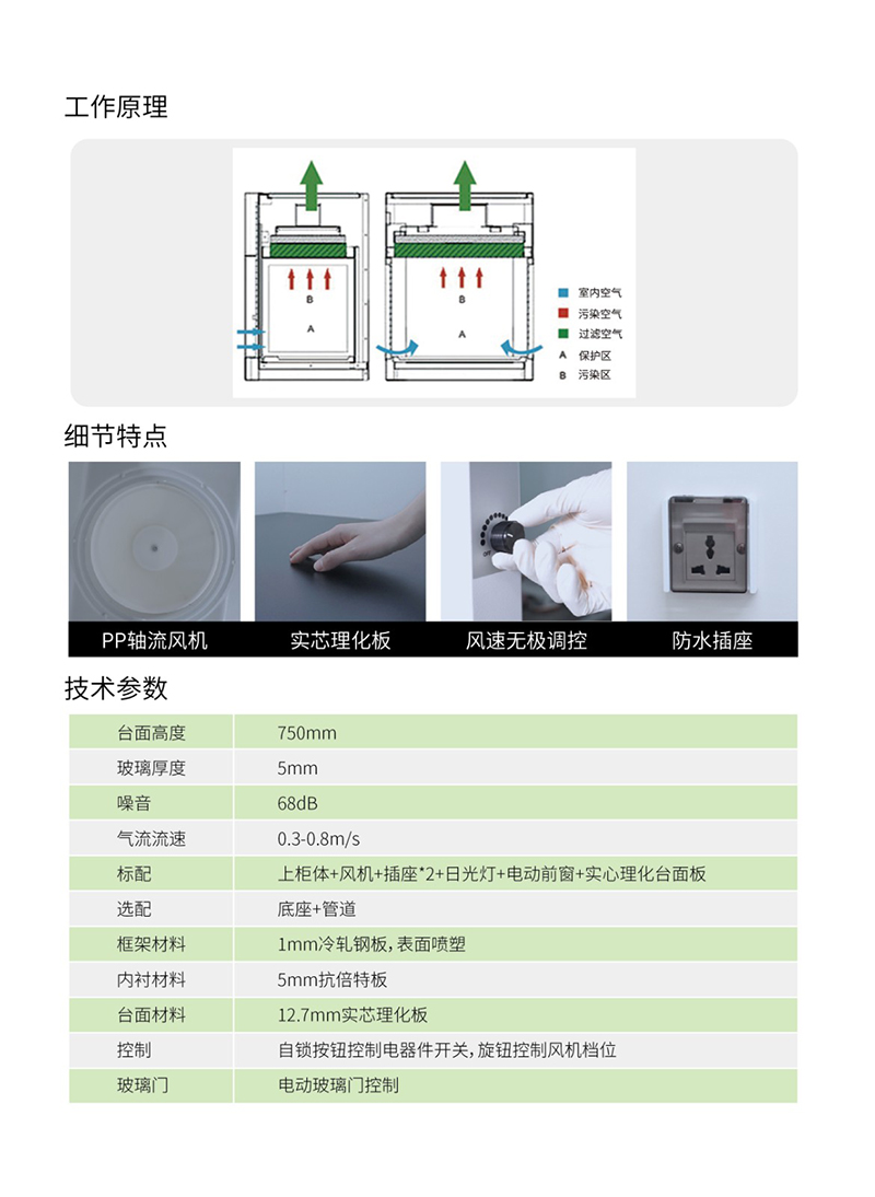 1.通风柜前视窗为电动视窗,可以在行程范围内的任意高度停止,通过自弹船型开关控制,分别按上、下现上下玻璃升降,断电锁止的功能 2.控制面板采用船型开关,操作方便,性能可靠 3.配置实验室专用PP轴流风机,可快速将实验操作时产生气体排出 4.操作区空间内无裸漏螺钉,美观更耐腐蚀