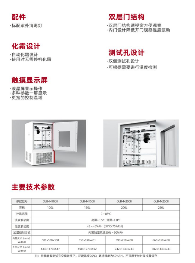 性能参数测试在空载条件下为:环境温度20℃,环境湿度50%RH ;不可用于长时间冷藏保存。 加水2L左右,预估损耗时间1-2天,随实际使用湿度的提升缩短,建议选配自动上水系统