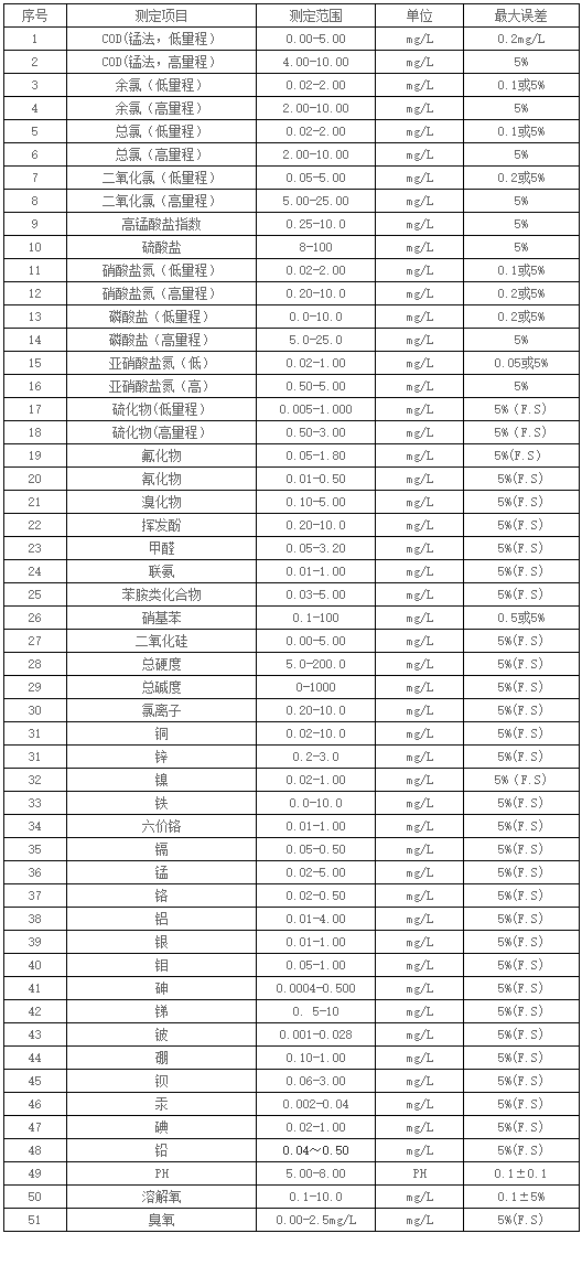 测量参数:CODMn、CODCr、氨氮、总磷、铜、铁、镍、六价铬、磷酸盐、亚硝酸盐等100多种个参数,用户可定制参数。