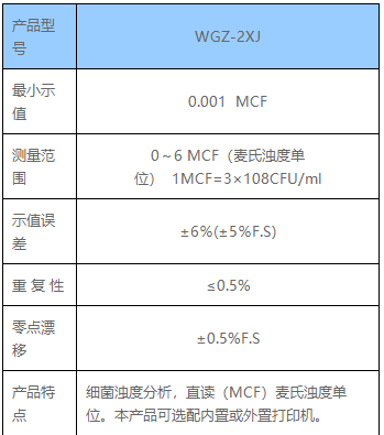 可用于测定待鉴菌株悬液中细菌浓度。本仪器采用(BaSO4)麦氏浊度标准溶液进行标定,采用MCF(McFarland)麦氏浊度单位。直接显示麦氏单位浊度值。主要适用于各级医疗卫生单位、生物制品、检疫机构及科研机构的细菌菌液浓度测定。
