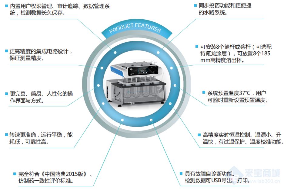 ● 可安装8个篮杆或桨杆(可选配特氟龙涂层),可放置8个1000ml高精度溶出杯。