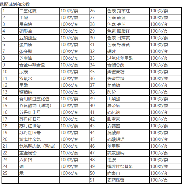 食品添加剂:二氧化硫、双氧水、亚硝酸盐、硝酸盐、苯甲酸钠、山梨酸、糖精钠、甜蜜素、硫酸镁