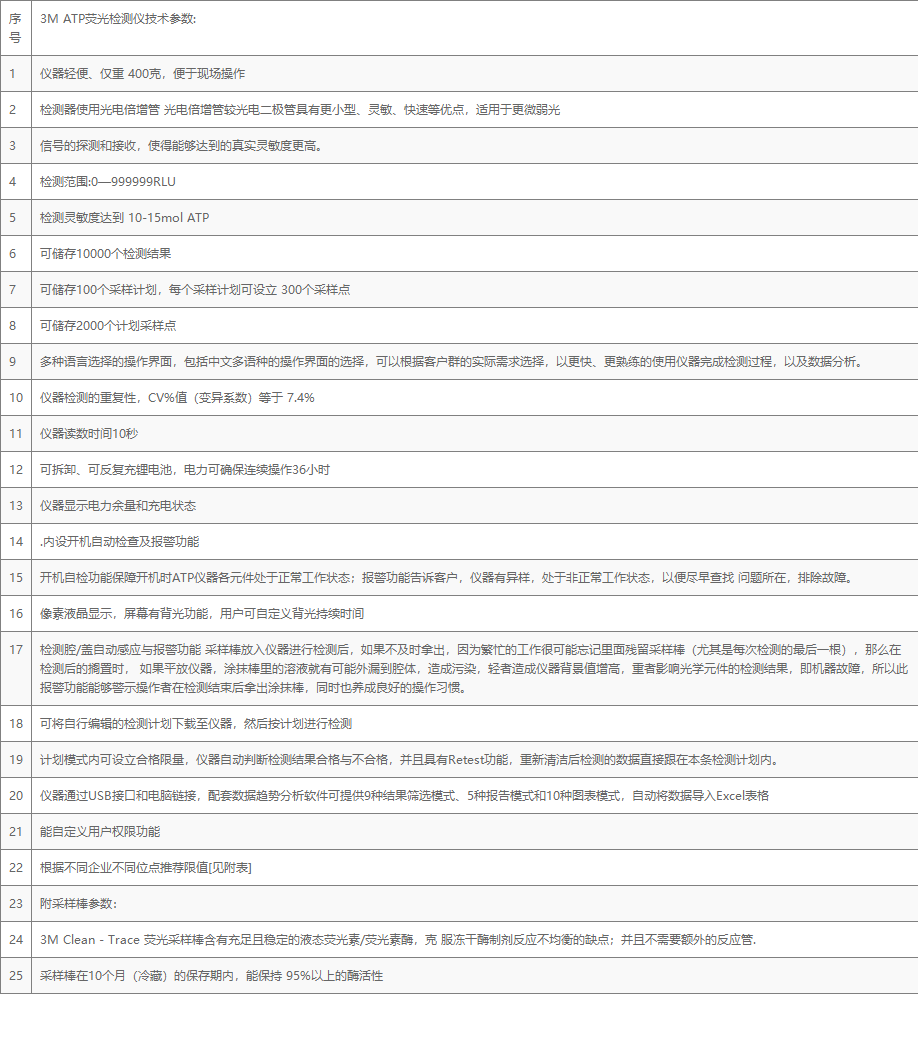 3M ATP荧光检测仪技术参数: