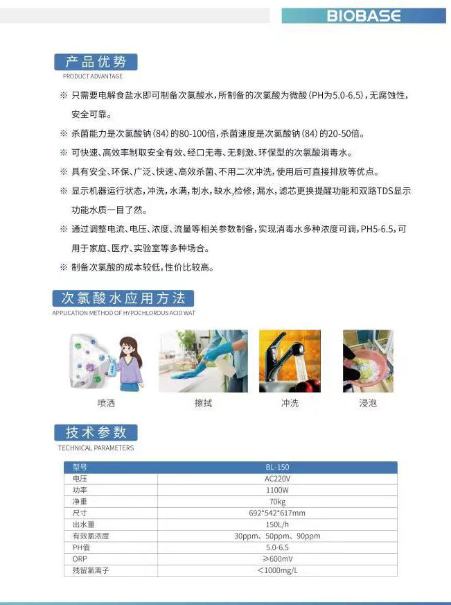 微酸(PH为5.0-6.5),出水量150L/h,有效氯浓度30ppm、50ppm、90ppm