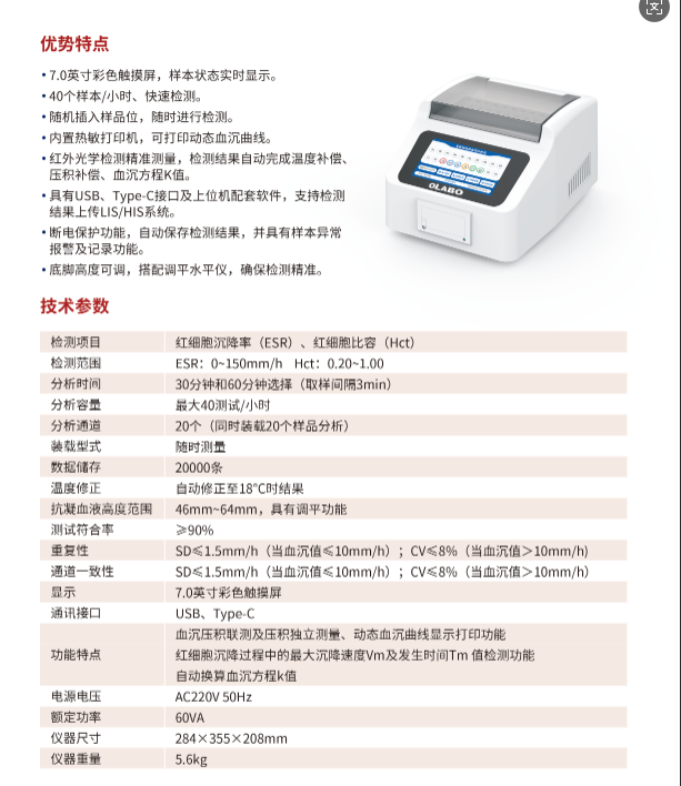 23、打印:内置热敏打印机,可打印动态血沉曲线